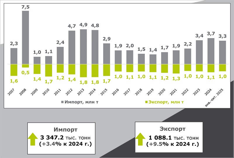 За десять месяцев года импорт стройматериала в Россию вырос на 111,2 тыс. тонн (+3,4%), до 3 347,2 тыс. тонн.