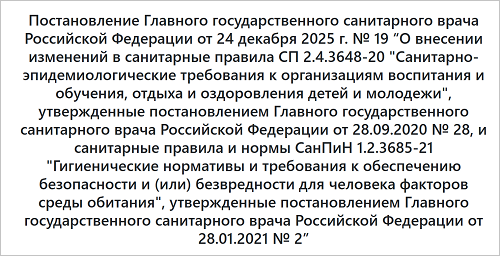 Это следует из Постановления Главного государственного санитарного врача РФ от 24 декабря 2025 г. №19 «О внесении изменений в санитарные правила СП 2.4.3648-20 "Санитарно-эпидемиологические требования к организациям воспитания и обучения, отдыха и оздоровления детей и молодежи"».