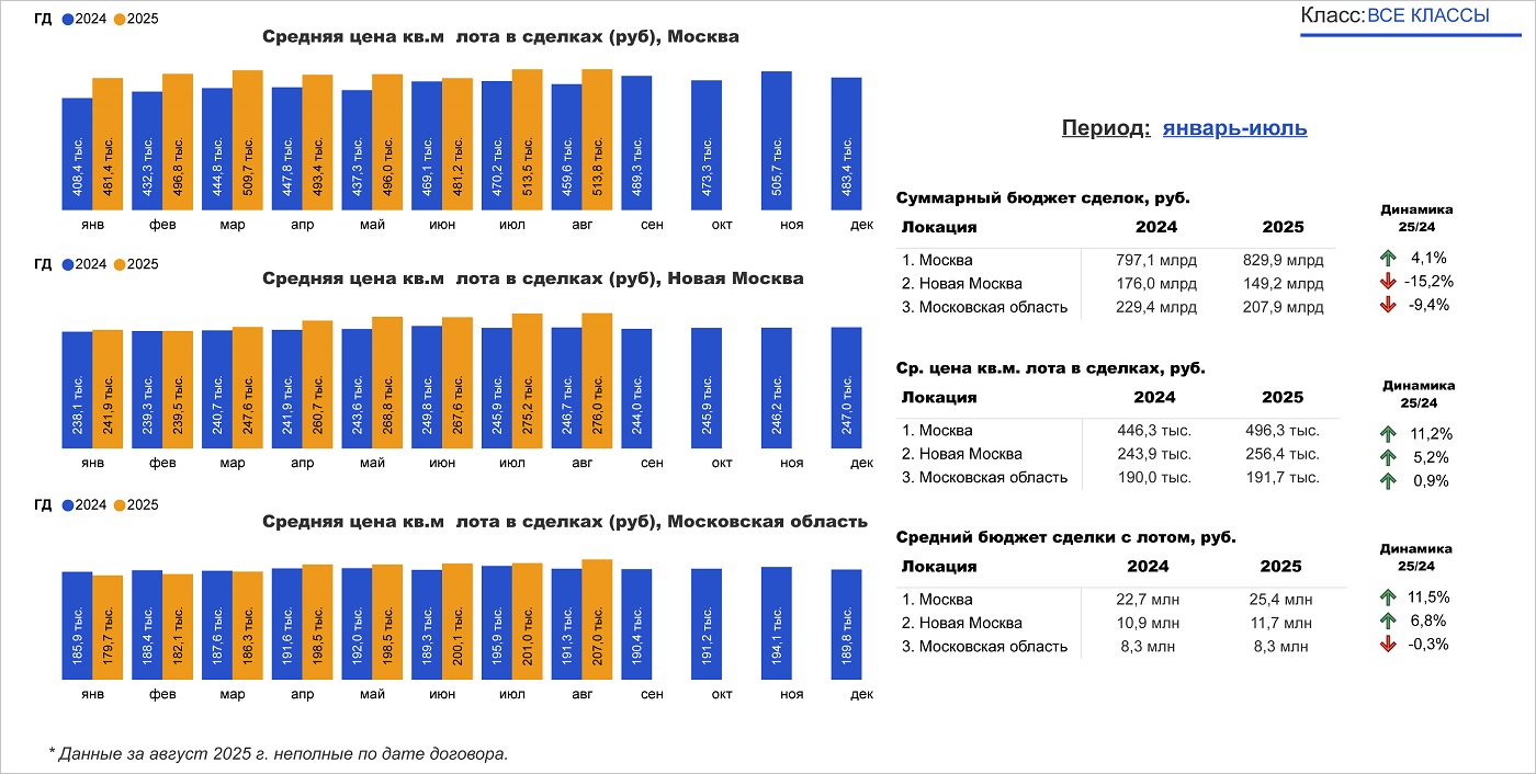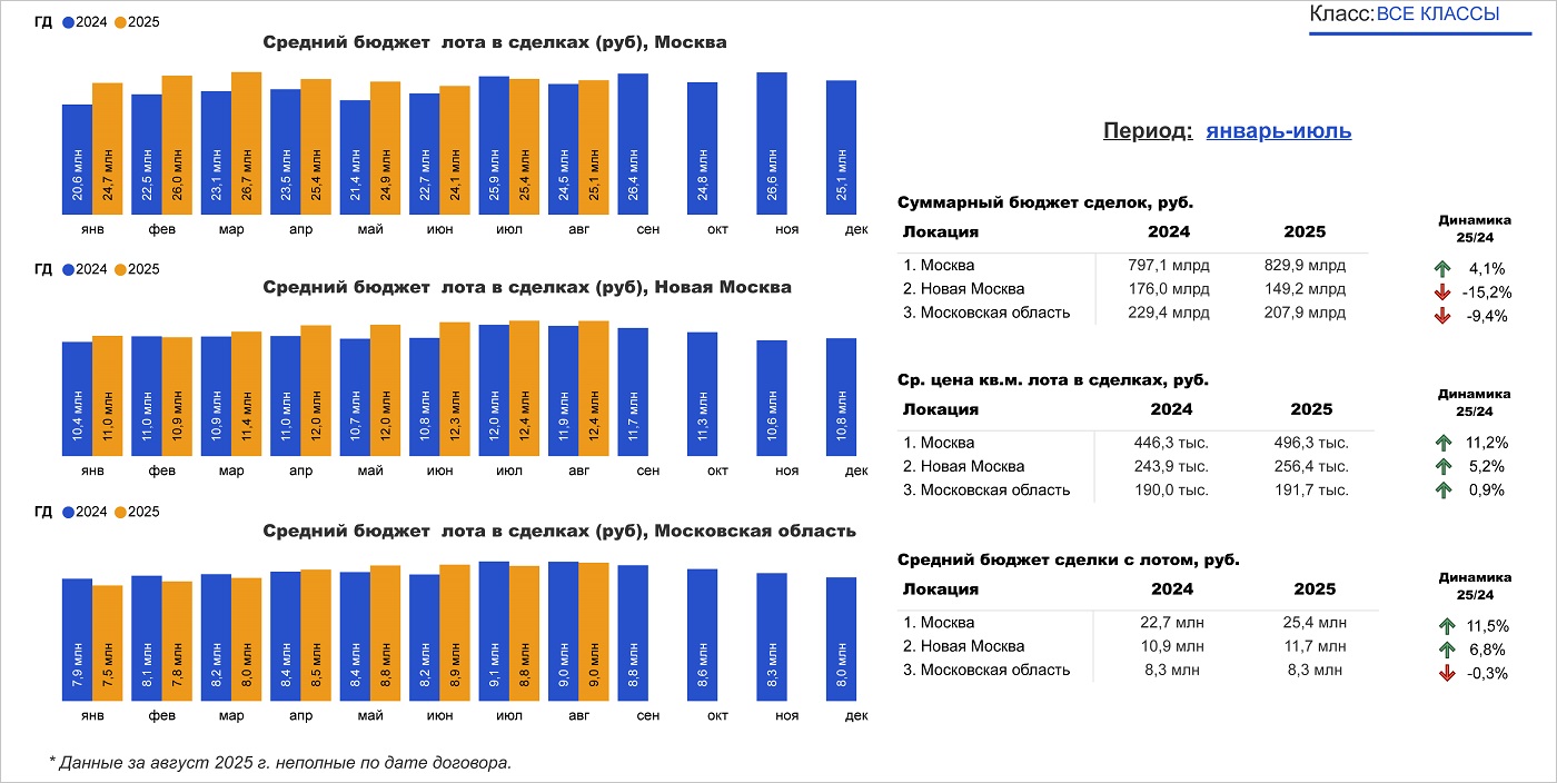 Средний бюджет сделки в Белокаменной увеличился до 25,1 млн руб. (+2,4%), в Новой Москве — до 12,4 млн руб. (+4,2%) и остался таким же, как год назад, в Подмосковье (9,0 млн руб.).