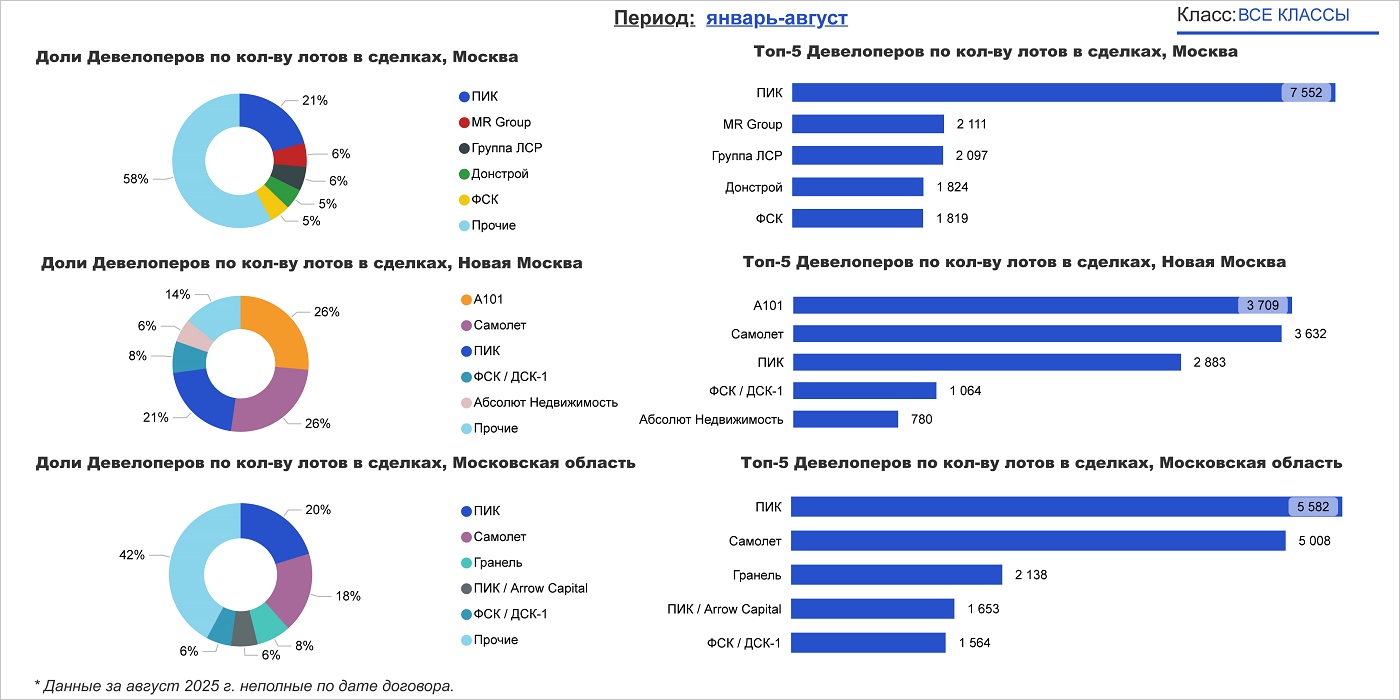 В первые восемь месяцев 2025 года рейтинг застройщиков по количеству продаж в двух локациях возглавил ПИК, а в Новой Москве — ГК А101.