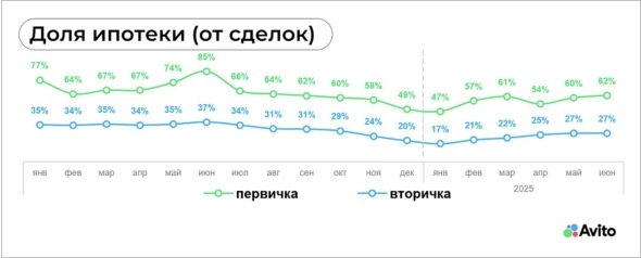 В первом полугодии 2025 года доля сделок с использованием ипотеки на рынке готового жилья в России снизилась с 34% до 23% по сравнению с тем же периодом прошлого года, а на рынке новостроек — с 74% до 57%. Спрос поддерживают в основном льготные программы и рассрочки от застройщиков, сообщил РБК со ссылкой на исследование аналитиков Авито Недвижимости.