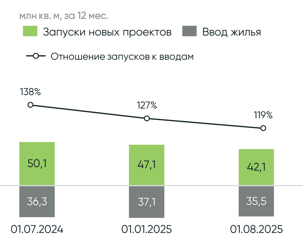 В августе 2025 года застройщики вывели на рынок на 24% меньше МКД, чем годом ранее (графики)