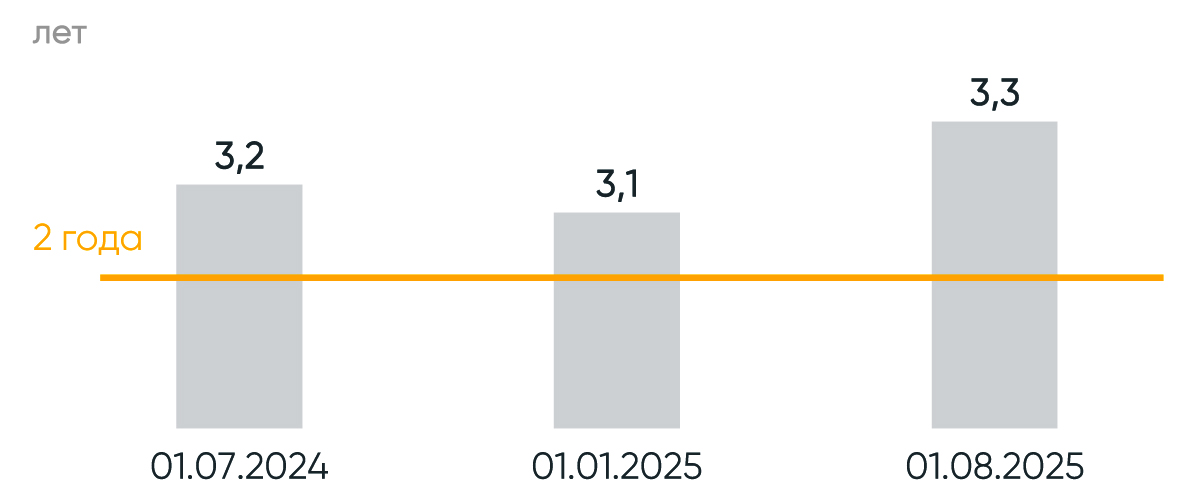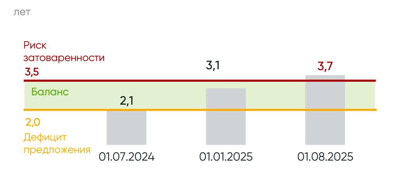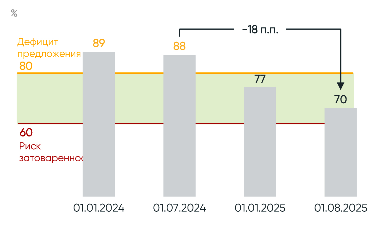01.08.2024 этот показатель оценивался в 88%. Тогда на рынке наблюдался дефицит предложения, возникший из-за стимулирования спроса в 2020—2024 годах.