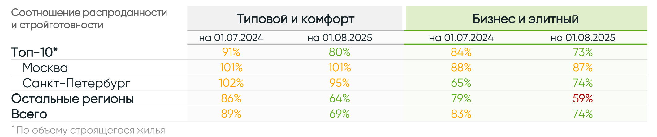 На соотношение распроданности и стройготовности оказало влияние завершение массовой льготной программы, и в первую очередь это отразилось на массовом сегменте, где показатель за год сократился на 20 п. п., до 69%.