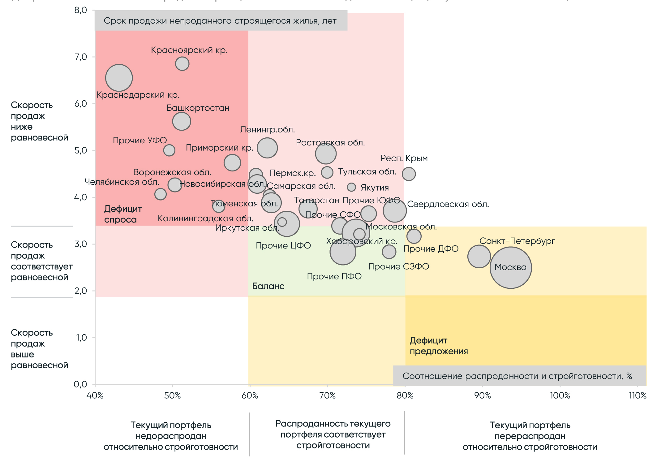 В Москве и Санкт-Петербурге все еще сохраняется риск дефицита предложения из-за высокой распроданности. В трех субъектах данный показатель и скорость продаж пришли к равновесному уровню.