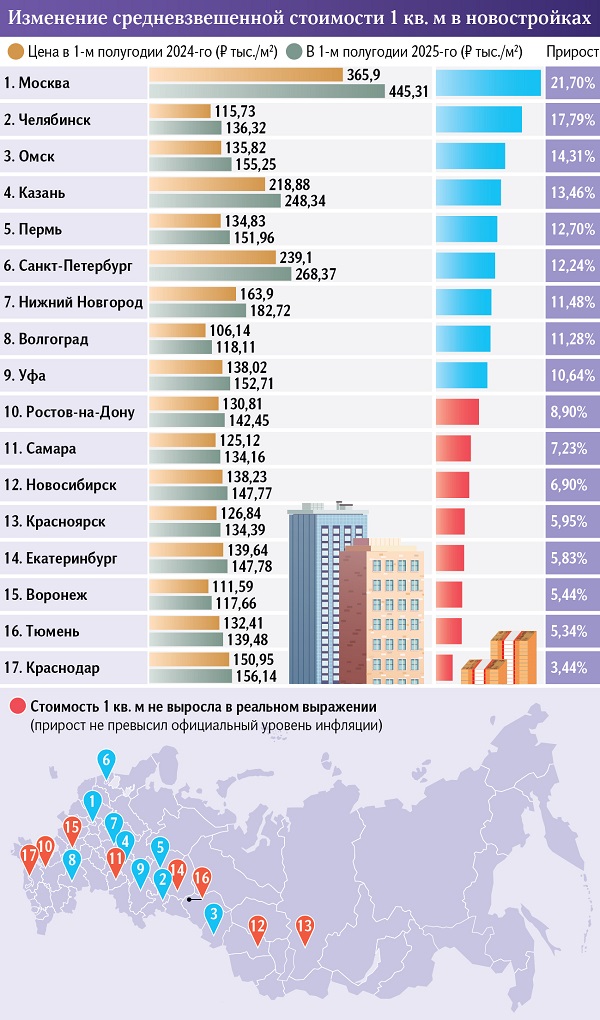 По оценкам федеральной компании «Этажи», самый значительный годовой рост средней цены 1 кв. м среди российских мегаполисов произошел в Челябинске (+18,9%), Казани (+18,7%), Омске (+17,5%), Перми (+14,8%) и Воронеже (+12,6%).