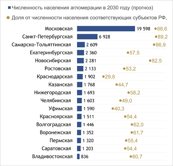 Прогнозные значения постоянного населения в 17 крупнейших агломерациях