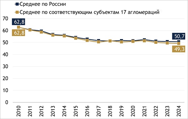 С 2010-го по 2024 год в среднем по агломерациям количество введенных жилых помещений на тысячу человек увеличилось в два раза. Но их средняя площадь снизилась, причем наиболее заметно — в многоквартирных домах (с 62,8 кв. м до 49,3 кв. м, или на 21%).