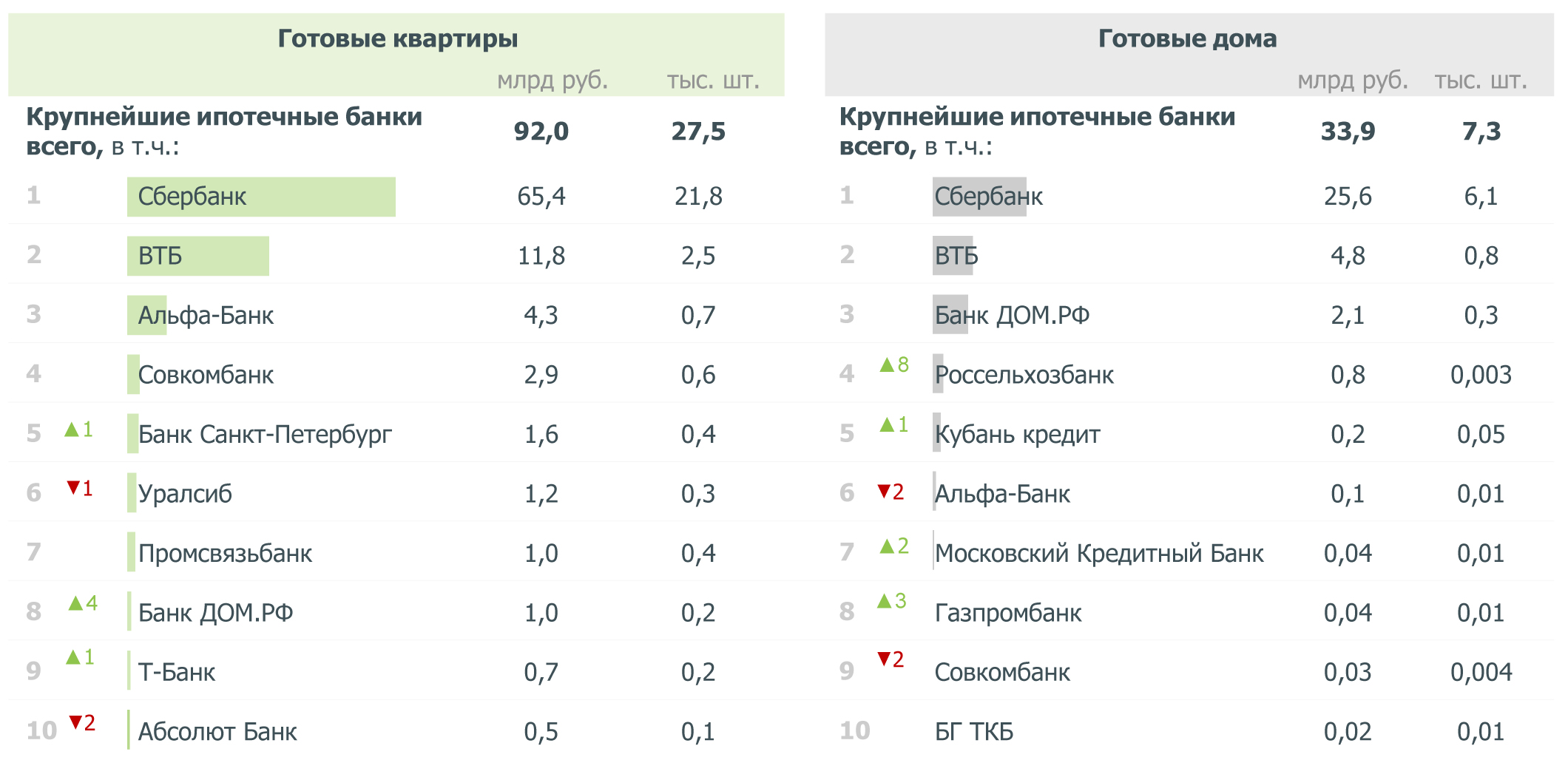 Выдачи ипотеки на покупку вторичных квартир увеличились до 27 тыс. ссуд (+17%) и 92 млрд руб. (+15%), а готовых домов — до 7 тыс. (+26%) на 34 млрд руб. (+33%).