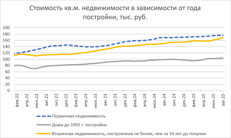 Разрыв между стоимостью 1 кв. м на первичном и вторичном рынках сохранился на уровне 51%, однако «свежая вторичка» (не старше 10 лет) стоила в августе всего на 5% дешевле новостроек.