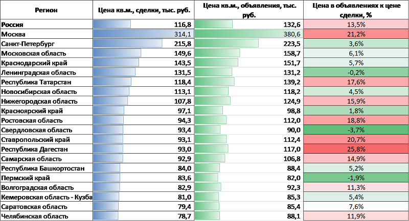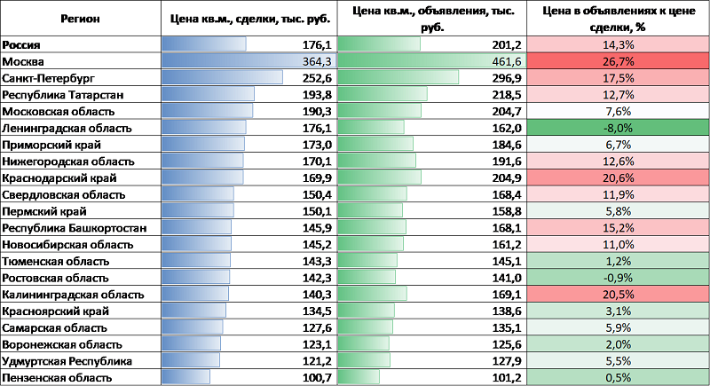 Разница в цене 1 кв. м готового жилья в объявлениях и сделках