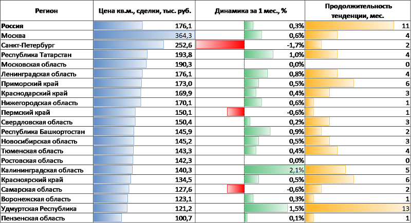 Третий месяц подряд наименьший уровень цен наблюдается в Пензенской области (100,7 тыс. руб. за 1 кв. м), Удмуртской Республике (121,42 тыс. руб.), Воронежской (123,1 тыс. руб.) и Самарской (127,6 тыс. руб.) областях.