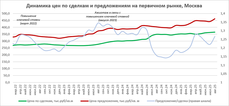 Разница в цене 1 кв. м новостроек в объявлениях и сделках, август 2025 года