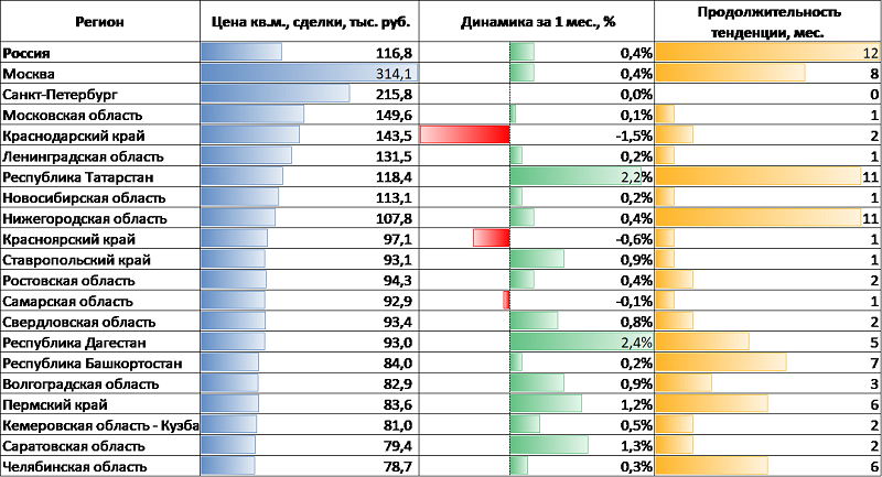 В двух регионах — Ленинградской и Ростовской областях — цены сделок оказались выше цен объявлений (-8,0%, -0,9% соответственно).