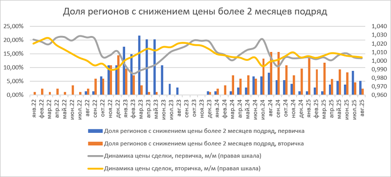 В августе, по данным специалистов ЦФА, снизилось количество регионов, в которых на протяжении последних трех и более месяцев подряд падают цены на жилье как на первичном, так и на вторичном рынках.