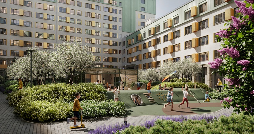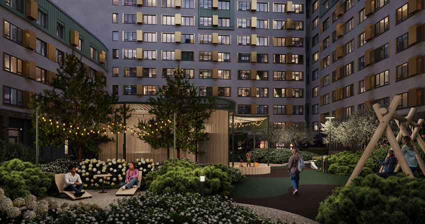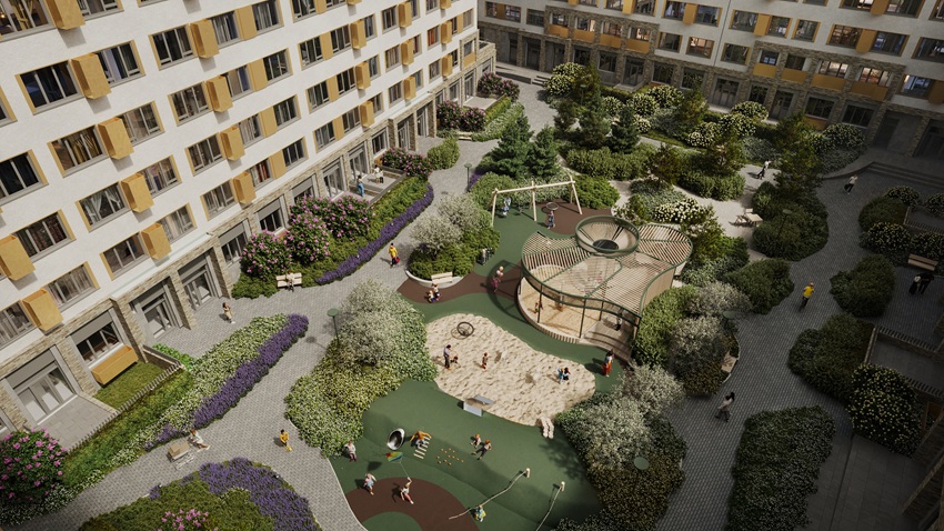 Точкой притяжения локации станет соседская площадь – городской плей-хаб, где расположатся зоны для активного досуга: детские площадки и лаунжи. Также на соседской площади планируется установка арт-объекта.