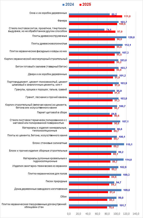 В целом с января по июль средний уровень производства 26 основных видов строительных материалов, изделий и конструкций по сравнению с тем же периодом прошлого года уменьшился на 9,1%.