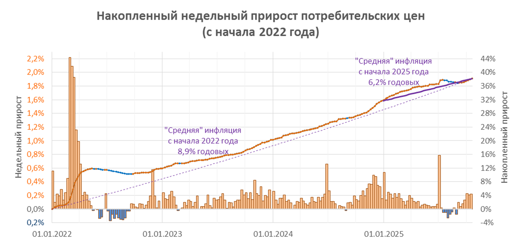 Осторожный шаг регулятора понятен. Инфляция снижается не так быстро, как хотелось бы. После сезонной дефляции в августе (-0,4%) и умеренной инфляции в сентябре (+0,34%) октябрь демонстрирует рост цен на +0,2% в неделю. В среднем с начала 2022 года инфляция составляет 8,9%. С начала 2025 года, по данным Росстата, цены выросли на 4,95%, что соответствует 6,2% годовых.