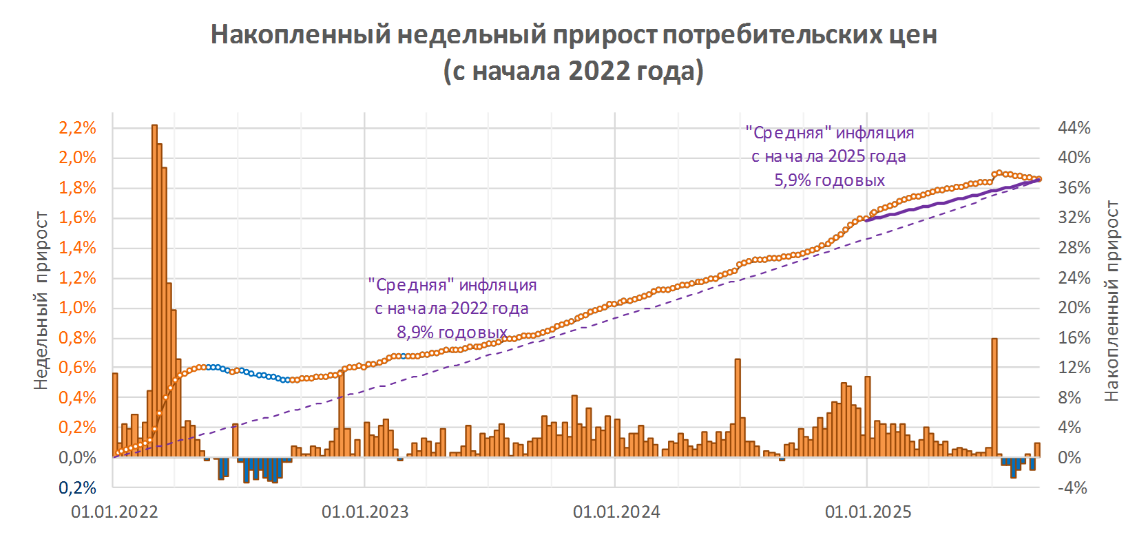 Инфляция стремительно снижается. В среднем с начала 2022 года она составляет 8,9%, но с начала 2025 года, по данным Росстата, цены выросли на 4,03%, что соответствует 5,9% годовых и значительно ближе к целевым 4%. По итогам августа впервые за два года была зафиксирована месячная дефляция — снижение индекса потребительских цен на 0,4 п. п. Впрочем, стоит помнить о сезонности: дефляция обычно фиксируется именно в августе-сентябре, после чего цены все-таки продолжают рост.