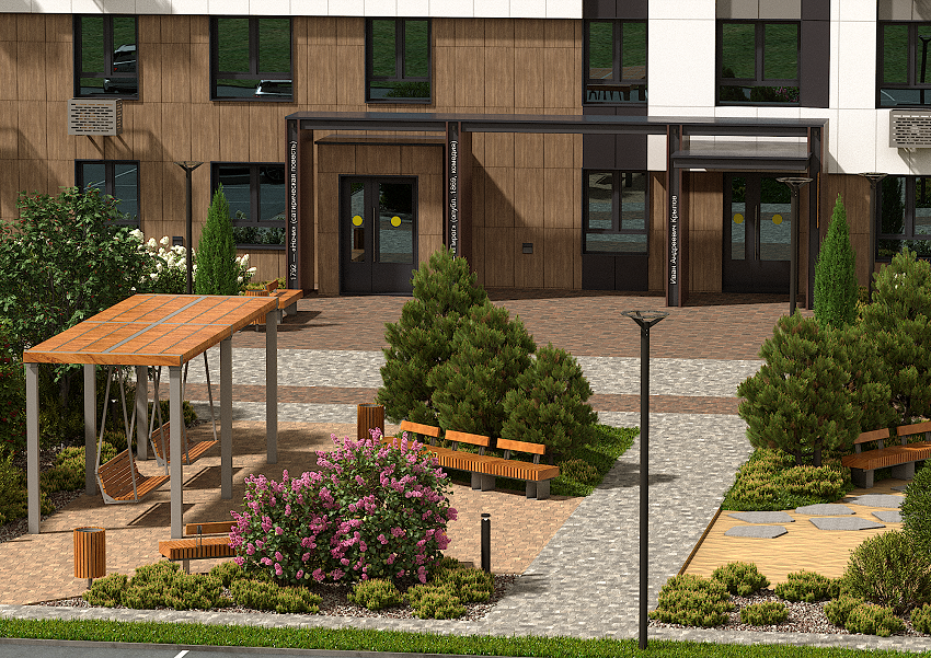 Каждое пространство грамотно зонировано: есть участки для малышей, игровые модули для школьников и спортивные комплексы для подростков. Авторское озеленение создает уютную атмосферу, а безбарьерная среда позволяет свободно и комфортно передвигаться с детскими колясками.