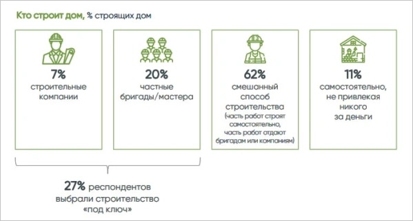 Согласно исследованию, 62% респондентов поручали подрядчикам часть работ по строительству, а остальные этапы возведения объектов ИЖС выполняли самостоятельно.