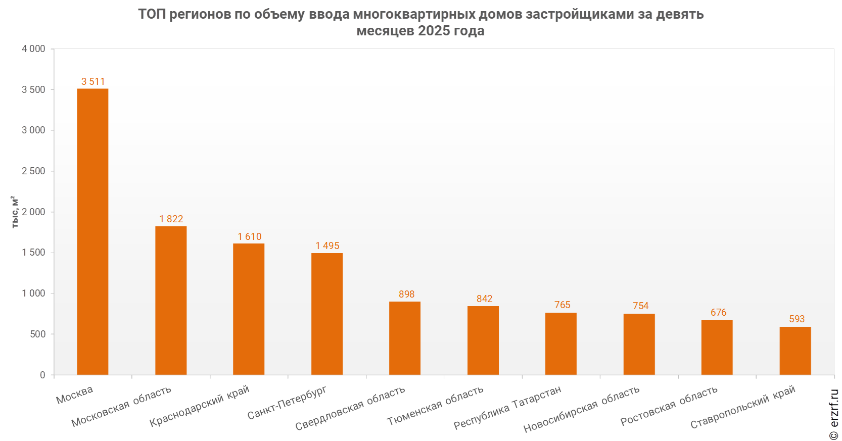 По данным Росстата, по итогам девяти месяцев 2025 года в ТОП‑10 регионов по объему ввода многоквартирных домов застройщиками вошли Москва, Московская область, Краснодарский край, Санкт‑Петербург, Свердловская и Тюменская области, Республика Татарстан, Новосибирская и Ростовская области, а также Ставропольский край.