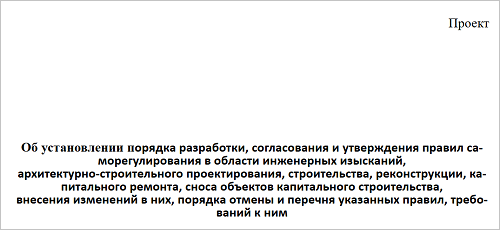 В ведомстве разработали проект приказа «Об установлении порядка разработки, согласования и утверждения правил саморегулирования в области инженерных изысканий, архитектурно-строительного проектирования, строительства, реконструкции, капитального ремонта, сноса объектов капитального строительства, внесения изменений в них, порядка отмены и перечня указанных правил, требований к ним».