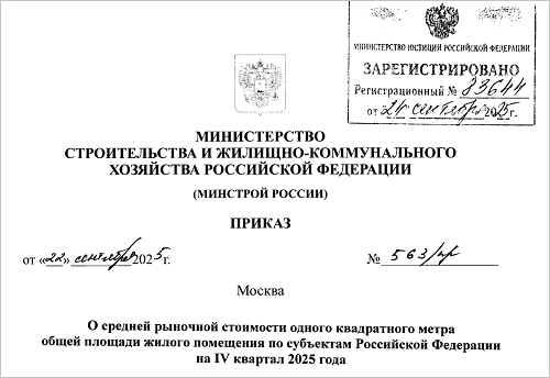 Опубликован приказ Минстроя России №563/пр от 22.09.2025 «О средней рыночной стоимости одного квадратного метра общей площади жилого помещения по субъектам Российской Федерации на IV квартал 2025 года»