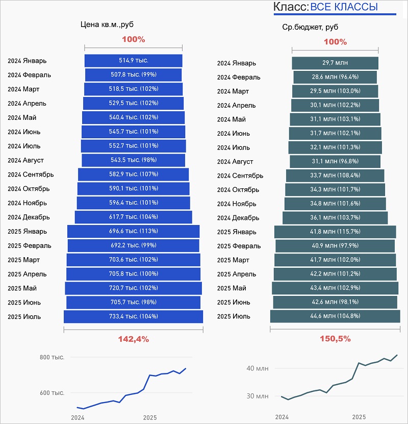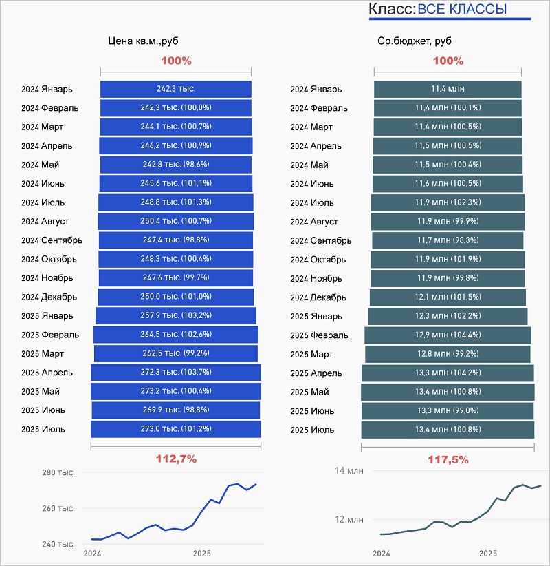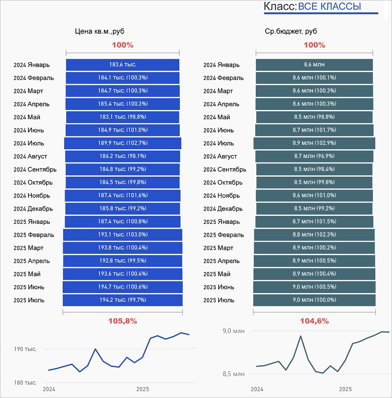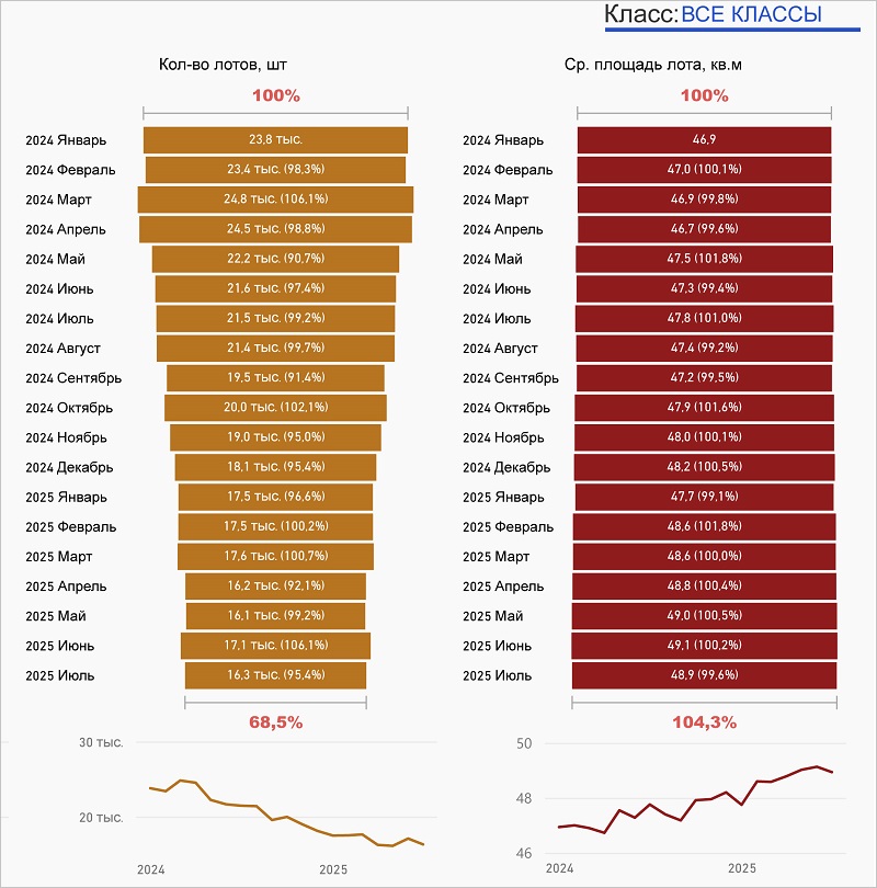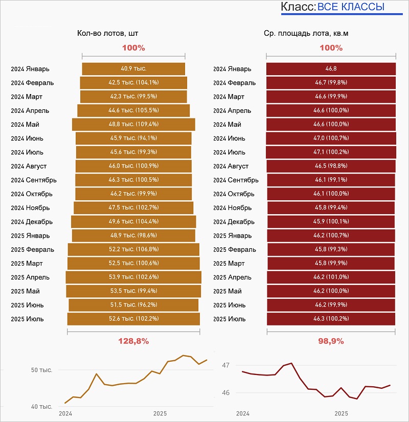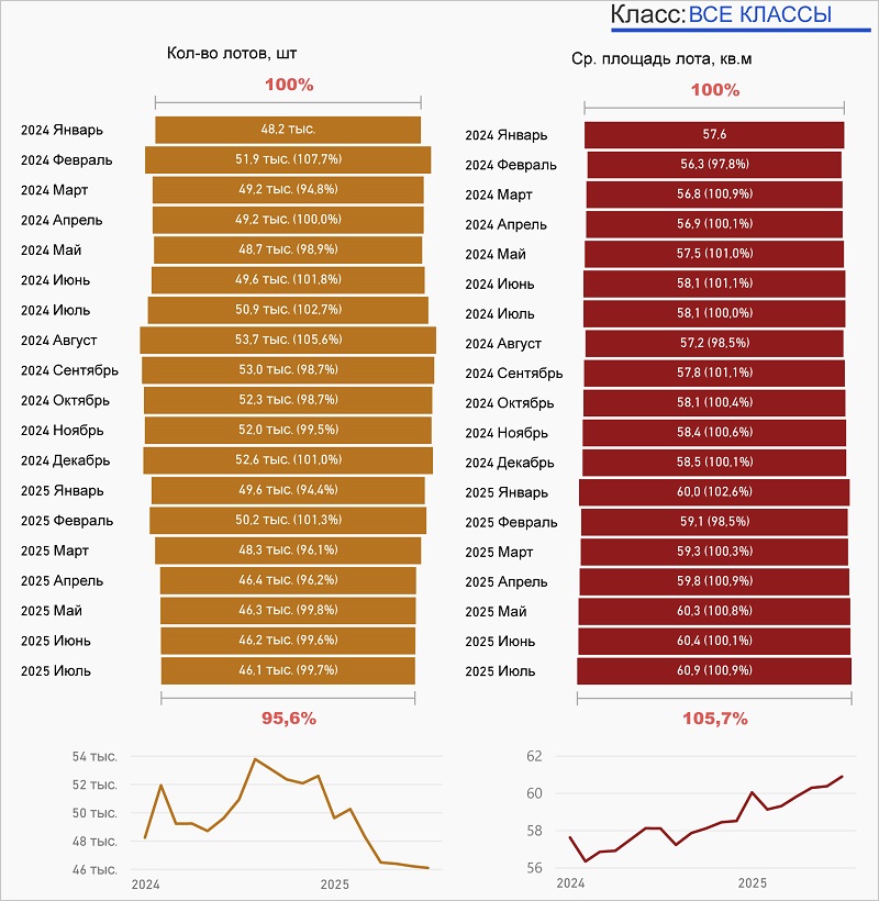 Продолжает расти площадь лота (за месяц с 60,3 кв. м до 60,4 кв. м). То есть жилье в Москве становится не только дороже, но и просторнее — возможно, за счет сдвига спроса в сторону объектов, более привлекательных для семей или инвесторов.