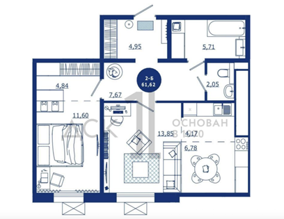 Как, например, в этой двухкомнатной квартире площадью 61,6 кв. м в ЖК «За ручьём». При этом кухня-гостиная достаточно большая, с удобной рабочей зоной, а пространство под гардеробную в спальне компактное и не «съедает» площадь: