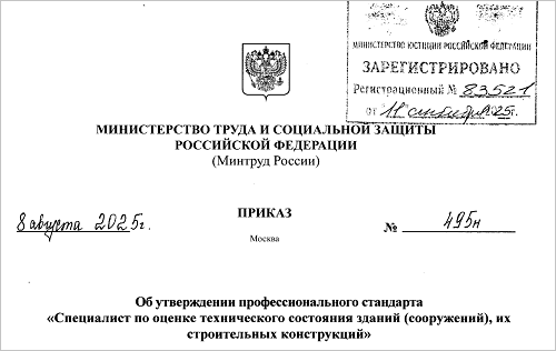 Профстандарт «Специалист по оценке технического состояния зданий (сооружений), их строительных конструкций» утвержден Приказом Минтруда России №495н от 08.08.2025.