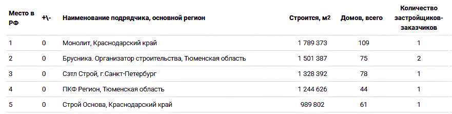 Пятерка лидеров закрепилась на своих позициях. На первом месте рейтинга по-прежнему генеральный подрядчик «Монолит» (ИНН 2308267988), в текущем строительстве у которого находится 109 многоквартирных домов общей площадью 1,79 млн кв. м.