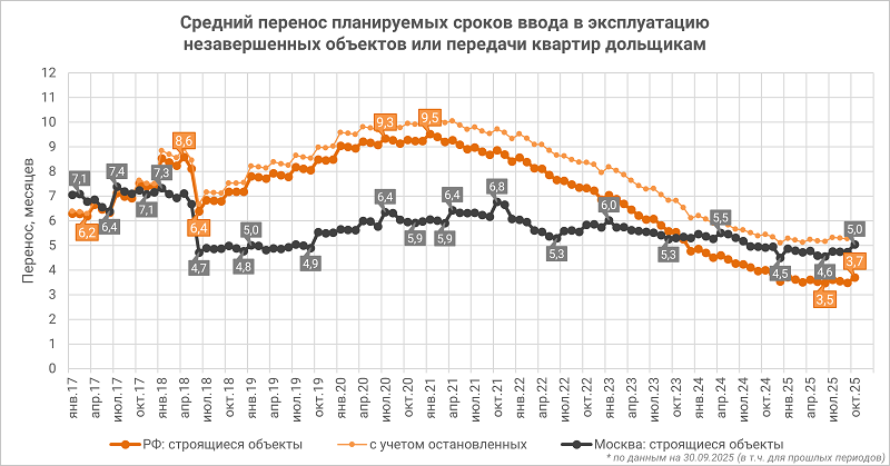 По состоянию на октябрь 2025 года средний перенос планируемых сроков ввода в эксплуатацию строящихся объектов составляет 3,7 месяца, а с учетом объектов, строительство которых остановлено, — 5,5 месяца.
