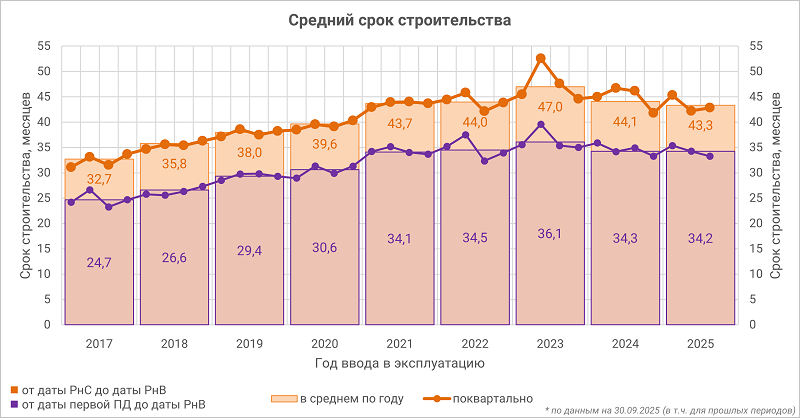 За последние 12 месяцев средний срок строительства многоквартирного дома от выдачи разрешения на строительство до ввода в эксплуатацию составил 42,6 месяца, а от даты опубликования первой проектной декларации до ввода в эксплуатацию — 33,8 месяца.