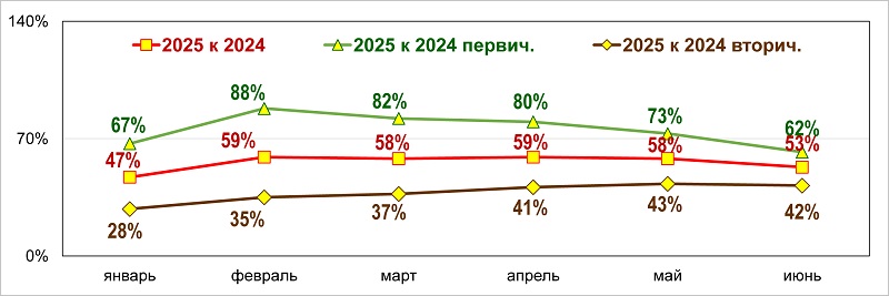 В январе — апреле тенденция была иной. Если «первичка» (в годовом сравнении) беспрерывно падала, то «вторичка», пусть немного, но все-таки росла.