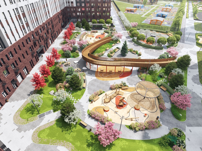 Во дворе установлен современный игровой комплекс, теннисные столы, детские и спортивные площадки, а для озеленения территории высажены более 350 растений, среди которых листовая липа, розовая яблоня Недзвецкого, клен Кримсон Кинг с темно-бордовыми листьями.