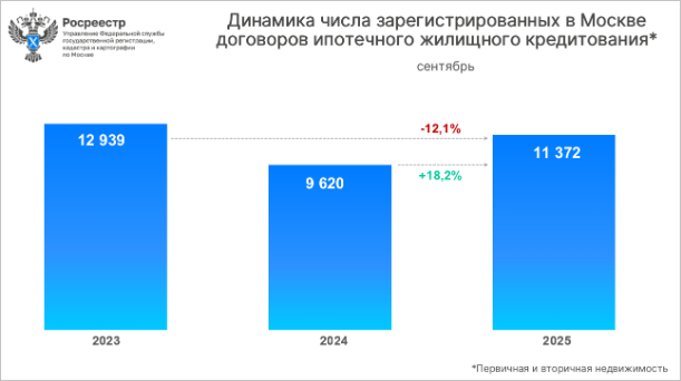 По сравнению с сентябрем 2024 года, когда было зарегистрировано 9 620 договоров, показатель вырос на 18,2%, но снизился на 12,1% относительно того же месяца 2023-го (12 939).