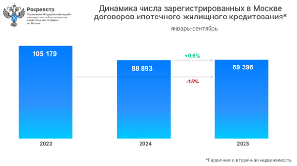 За девять месяцев текущего года Управление Росреестра по Москве зарегистрировало 89 398 договоров жилищной ипотеки.