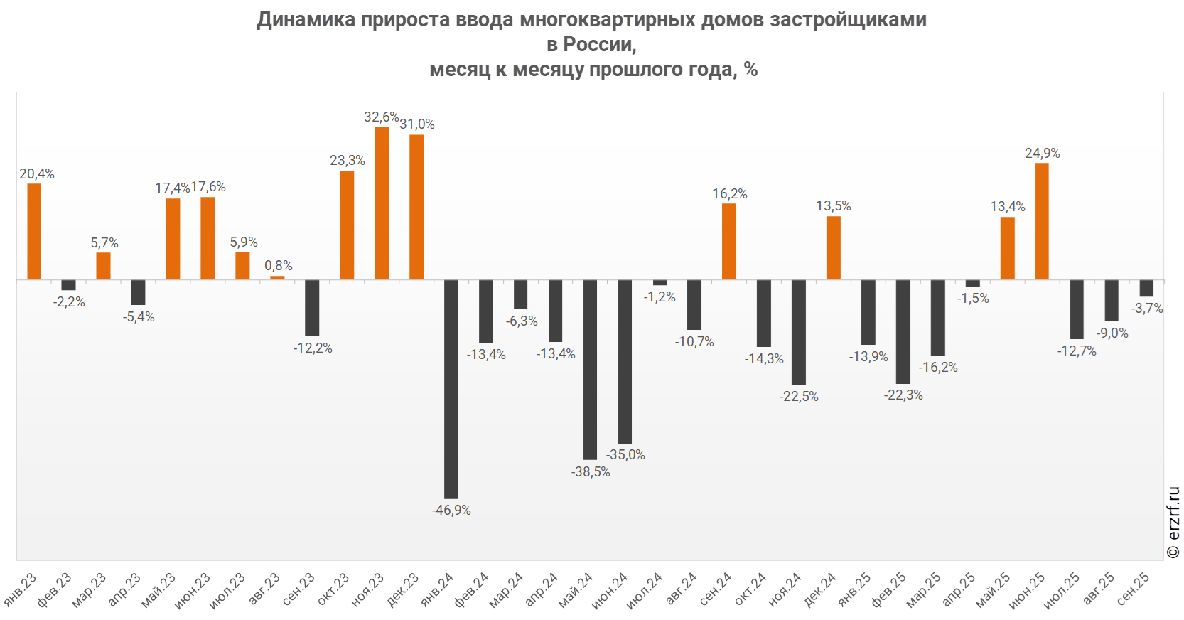 За январь — сентябрь 2025 года ввод многоквартирных домов застройщиками в России составил 24,2 млн м2, что на 5,7%, или на 1,5 млн м2 меньше аналогичного значения за тот же период 2024 года.