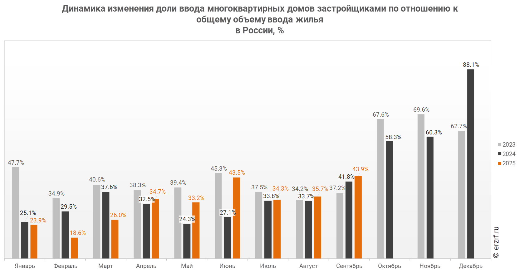 В сентябре 2025 года доля ввода многоквартирных домов застройщиками по отношению к общему объему ввода жилья в России составила 43,9%, что на 2,1 п. п. больше аналогичного значения за тот же период 2024 года.