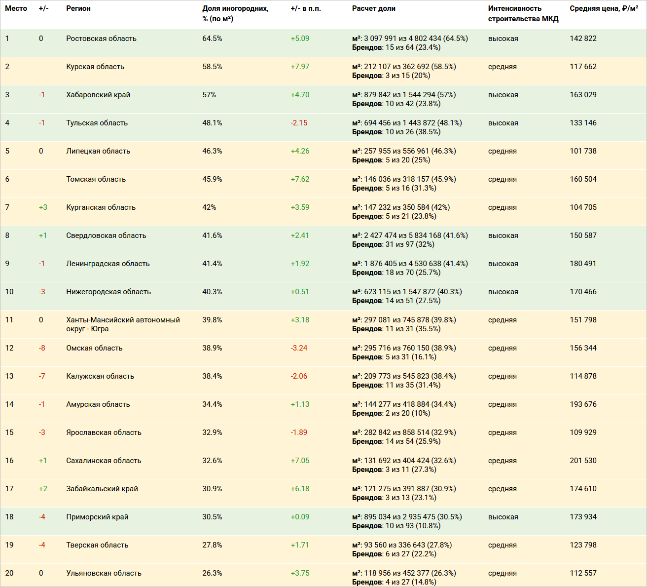 Регионами с полным отсутствием иногородних застройщиков в ТОП остаются Кировская, Челябинская, Саратовская, Иркутская области, а также Республика Саха.