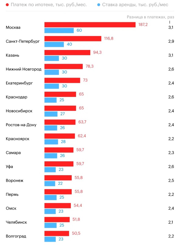 Согласно расчетам РБК, в конце лета во всех городах-миллионниках снимать квартиру было дешевле, чем покупать ее в ипотеку. Средняя ставка арендной платы за «однушку» оказалась в 2,1—3,1 раза ниже месячного платежа по кредиту за такое же жилье.
