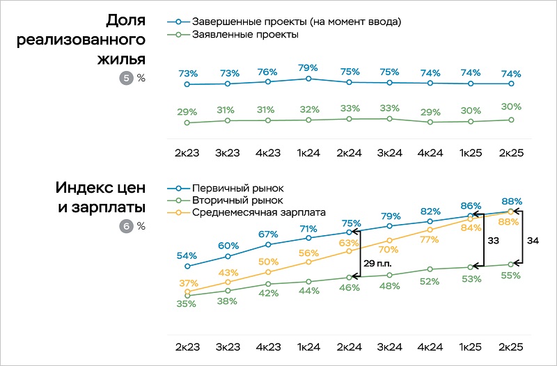 Квартальный рост цен замедлился с 2,0% до 1,6%, а с корректировкой на инфляцию составил 0,6%. Это снижение объясняется ростом предложения и отменой банковских комиссий за выдачу ипотеки с господдержкой, которые зачастую включались в стоимость жилья.