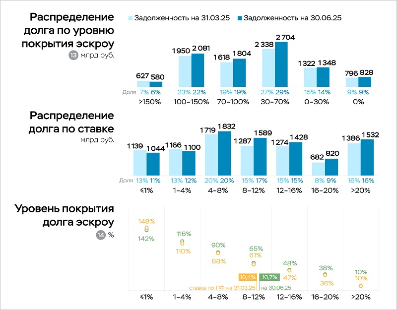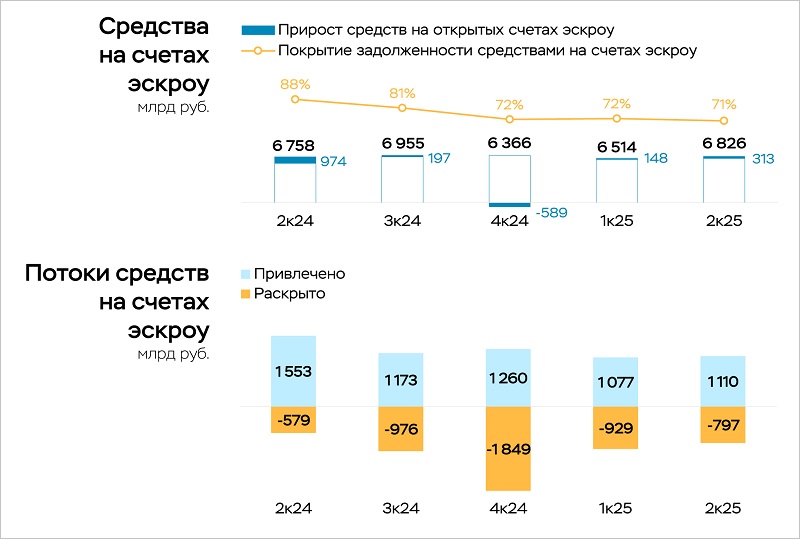 На счета эскроу, как и в I квартале, поступил 1,1 трлн руб. Их раскрытие снизилось (с 0,9 трлн руб. до 0,8 трлн руб.), поэтому общий объем средств проектного финансирования увеличился с 6,5 трлн руб. до 6,8 трлн руб.