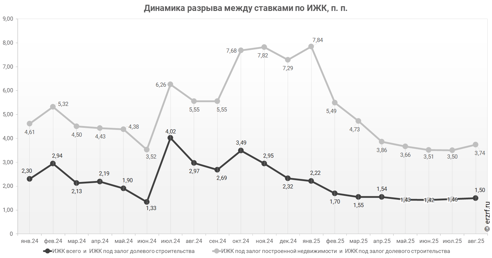 За год разница между ставками ипотечных жилищных кредитов всех видов и для долевого строительства уменьшилась с 2,97 п. п. до 1,5 п. п. При этом в августе разница между ставками увеличилась по сравнению с июлем (1,46 п. п.) и июнем (1,42 п. п.). Разница между ставками ипотечных жилищных кредитов под залог готового жилья и для долевого строительства за год уменьшилась с 5,55 п. п. до 3,74 п. п.