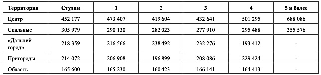 Средние цены по количеству комнат (для домов со сроком сдачи до одного года),
