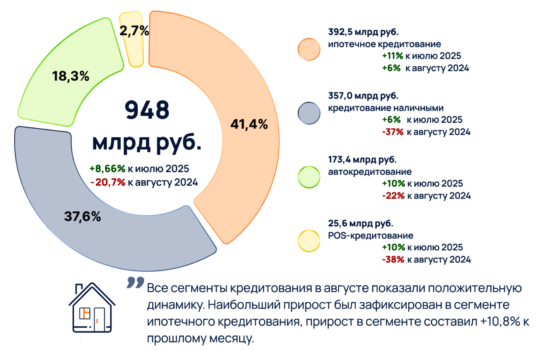 Аналитики отметили, что в конце лета все сегменты кредитования показали положительную динамику. Наибольший рост — до 392,5 млрд руб. — был зафиксирован в ипотеке (+10,8% за месяц и +6,3% за год).