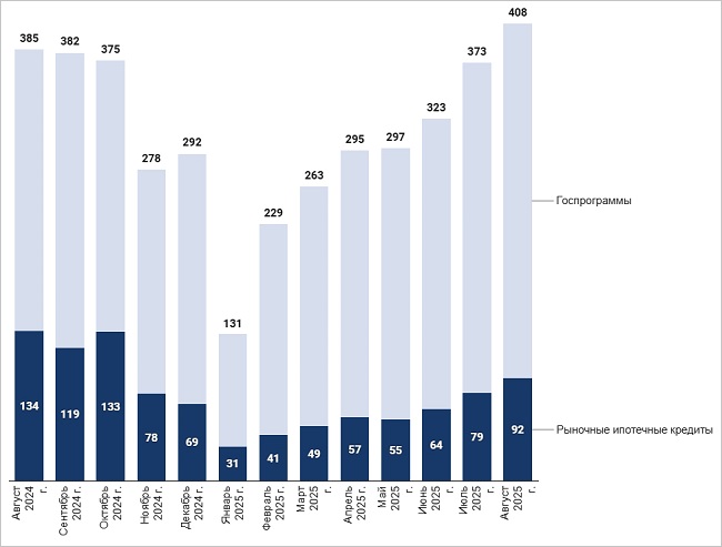 В августе заемщики получили 52,5 тыс. льготных кредитов (+8% за месяц) на сумму 315,8 млрд руб. (+7%) и 38,8 тыс. займов — на рыночных условиях (+10%) на 92,3 млрд руб. (+17%).