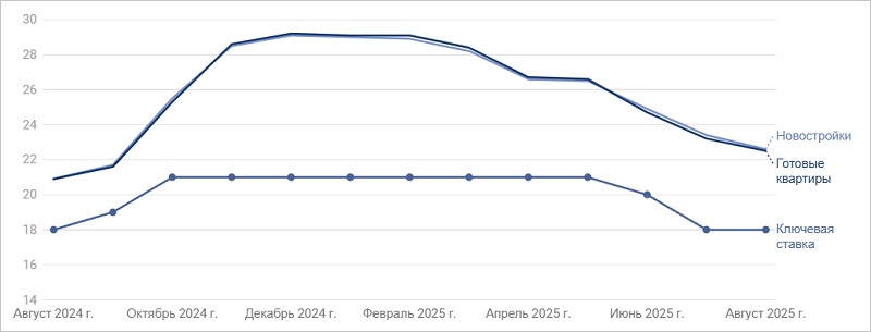 На первичном рынке средневзвешенные ставки сократились на 0,8 п. п., до 22,6%; на вторичном — на 0,7 п. п., до 22,5%. В сегменте готовых домов снижение составило 1,3 п. п., до 22,5%; в ИЖС — 0,2 п. п., до 21,9%.