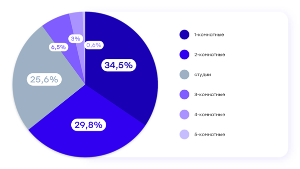 Если анализировать квартирографию проданных лотов в GloraX Экосити, наибольший объем спроса пришелся на однокомнатные и двухкомнатные квартиры (35% и 30% соответственно), сделки со студиями составили более четверти (26%). Трехкомнатные и четырехкомнатные варианты выбрали 7% и 3% покупателей соответственно, пятикомнатные — 1%. Большую популярность компактных по площади квартир можно объяснить привлекательностью таких лотов для частных инвесторов на старте продаж, когда стоимость квадратного метра минимальна. По мере роста строительной готовности соотношение частных инвесторов и конечных покупателей будет меняться в пользу последних.